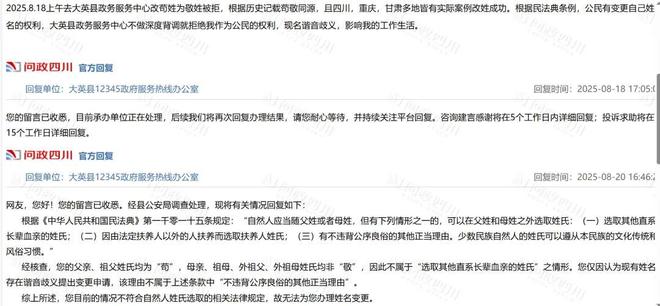 8月18日,该市民在问政四川投诉称,由于“现名谐音歧义,影响工作生活”,她希望将苟姓改为敬姓,但是未能成功。