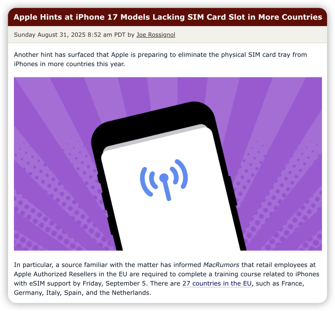 据外媒 MacRumors 爆料,一位知情人士称,苹果内部已悄悄开始进行 eSIM 业务的动员计划。