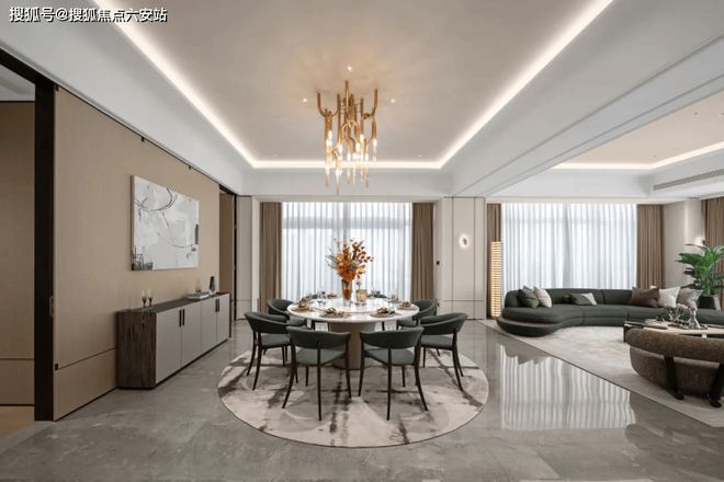 外立面:采用全面屏落地窗+弧形转角玻璃,灰蓝色玻璃与金色线°环幕视野与自然通风。